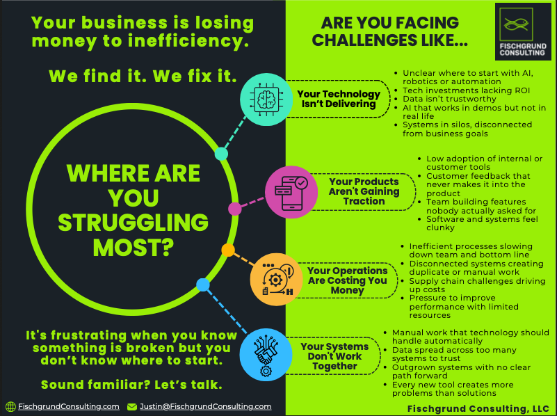 Our work spans Robotics, AI and automation, digital strategy, operational efficiency, and user-centered software solutions. No matter the challenge, the goal is the same. Help you work smarter, grow stronger, and reduce wasted effort.